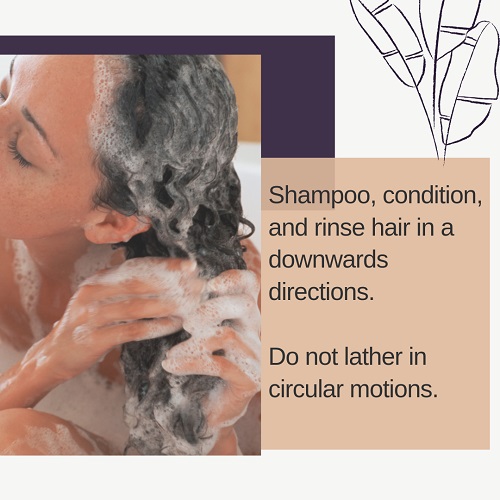 Never lather the hair in circled motions. Rather shampoo, condition, and rise going in a downwards motion to keep the direction of the hair and cuticles together.