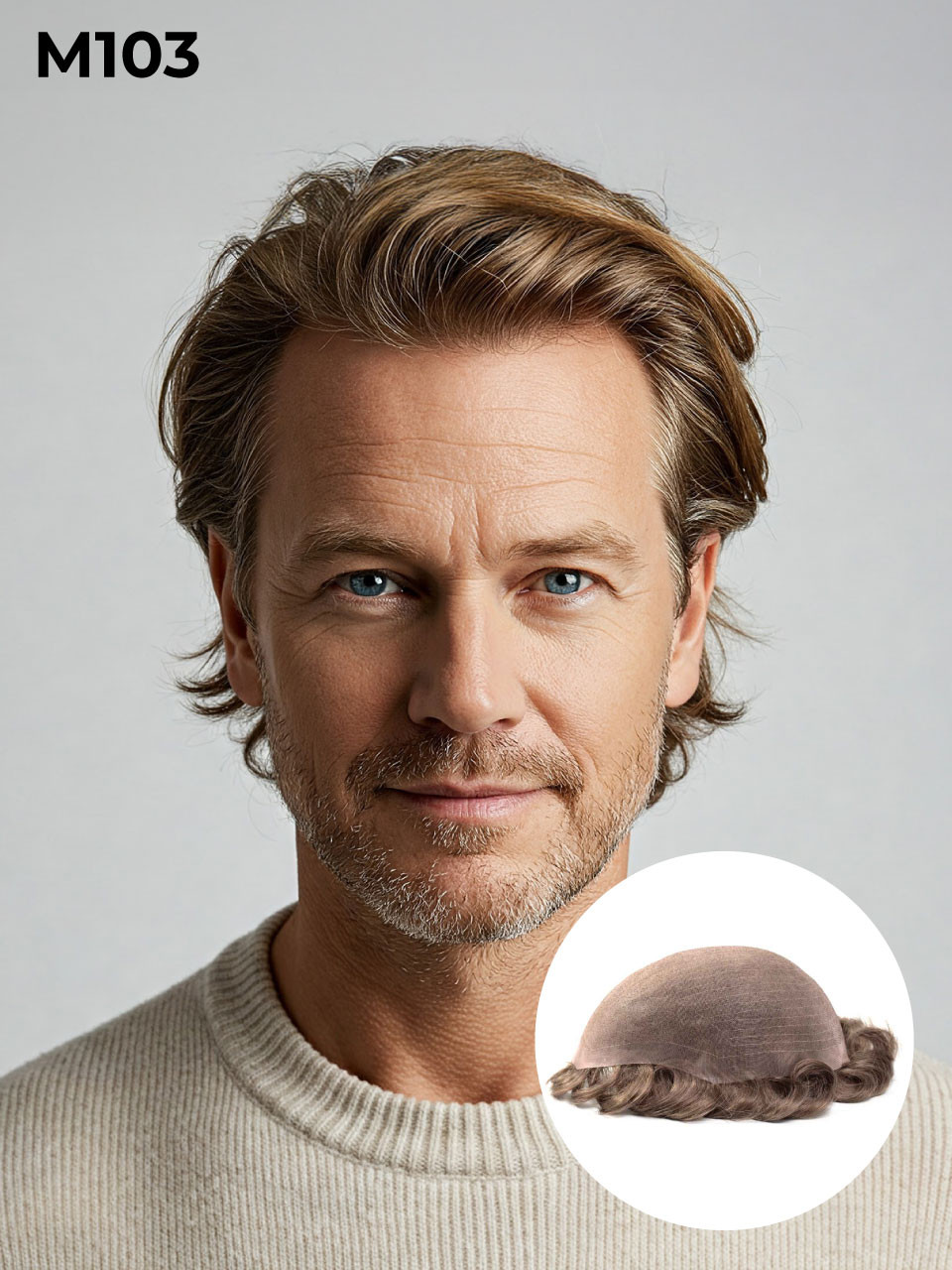 The M103 is a breathable and natural-looking hair system. Using fine welded monofilament lace to provide that extra bit of durability, this men's toupee can also hold 120% hair density for those who want plenty of hair coverage. It comes in a size of 7.5"x10" but can be cut down to any size side-to-side depending on your preferences, provided you leave a length of 7.75" front-to-back. With the proper maintenance, it can last more than a couple of months for the wearer.